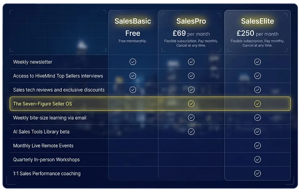 Personalised guidance when the stakes are highest. Work through your live deals, pipeline challenges, and career decisions with a coach who's actually done the job. (elite tier only)